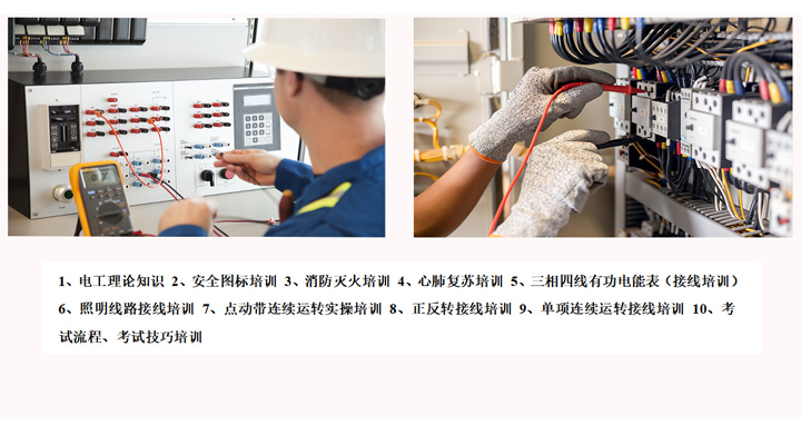 1、零基础速成教学:理论精讲:电路图识读、电气安全规范、万用表/兆欧表使用; 实操全覆盖:配电箱安装、PLC基础接线、家庭/工厂电路故障排查; 小班VIP授课:1个老师带5个学员,手把手教到会为止!